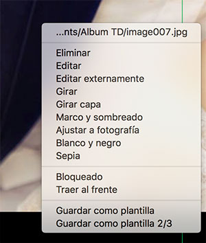Album Turbo Design tiene un menú principal en la parte superior de la ventana (o del monitor en Mac) y además dispone de menus auxiliares que se obtienen pulsando el botón derecho del ratón (en Mac también puede pulsar Ctrl y hacer clic con el ratón), los menús auxiliares son: